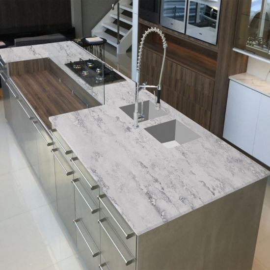 6003 CUARZO DE HORMIGÓN CON TEXTURA DE COPO DE NIEVE GRIS TROPICAL El cuarzo hormigón es un material de piedra artificial de cuarzo con un tratamiento especial. Similar a un acabado mate, el acabado de hormigón altera ligeramente el color del cuarzo en comparación con el clásico acabado pulido. Este acabado también se conoce como "cepillado" en el caso del granito.