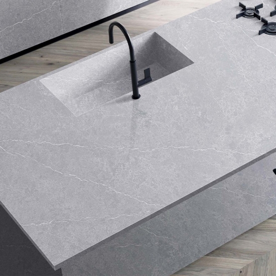 El cuarzo hormigón es un material de piedra artificial de cuarzo con un tratamiento especial. Similar a un acabado mate, el acabado de hormigón altera ligeramente el color del cuarzo en comparación con el clásico acabado pulido. Este acabado también se conoce como "cepillado" en el caso del granito.