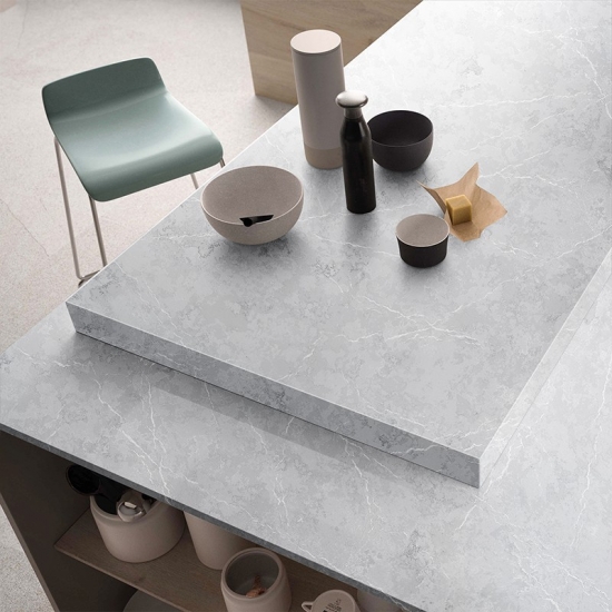El cuarzo blanco cemento con textura de copo de nieve es una piedra artificial con un tratamiento especial. Similar a un acabado mate, el acabado de hormigón altera ligeramente el color del cuarzo en comparación con el clásico acabado pulido. Este acabado también se conoce como "cepillado" en el caso del granito.