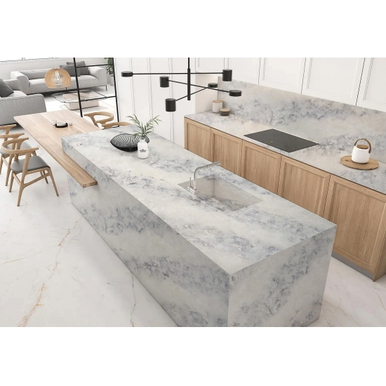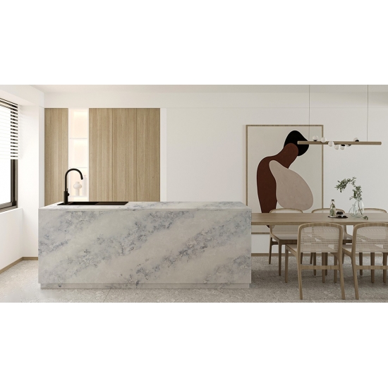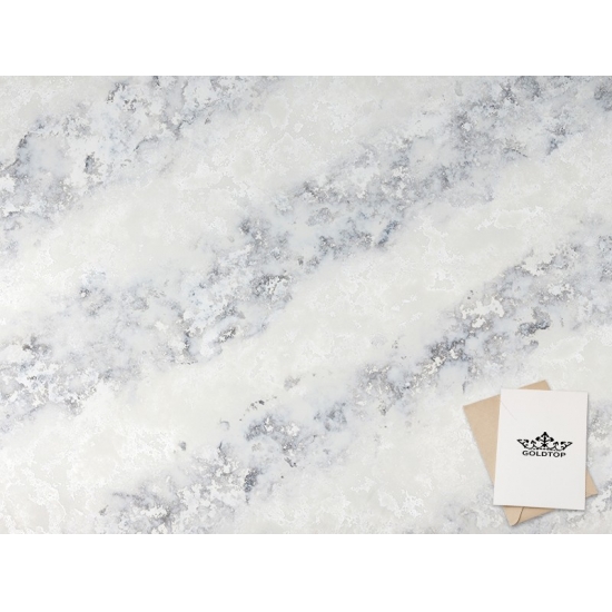El cuarzo blanco cemento con textura de copo de nieve es una piedra artificial con un tratamiento especial. Similar a un acabado mate, el acabado de hormigón altera ligeramente el color del cuarzo en comparación con el clásico acabado pulido. Este acabado también se conoce como "cepillado" en el caso del granito.