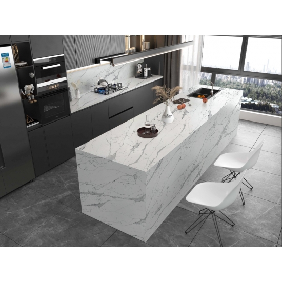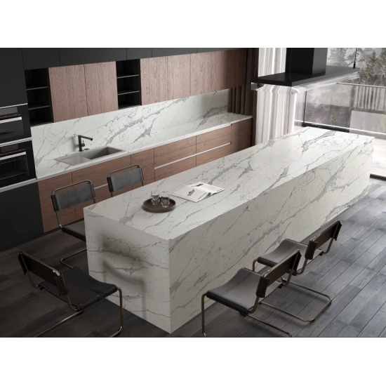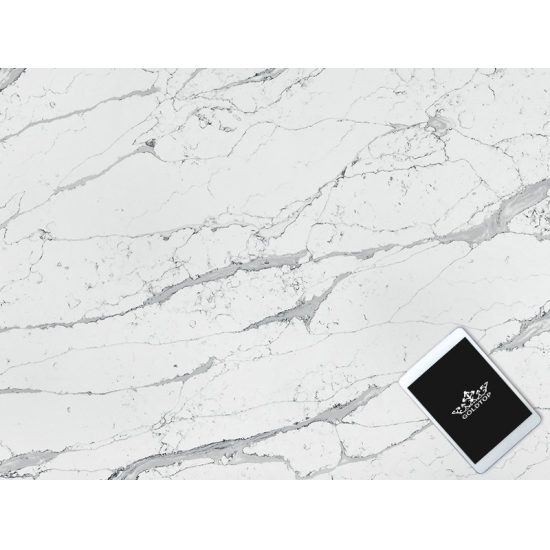 El cuarzo blanco cemento con textura de copo de nieve es una piedra artificial con un tratamiento especial. Similar a un acabado mate, el acabado de hormigón altera ligeramente el color del cuarzo en comparación con el clásico acabado pulido. Este acabado también se conoce como "cepillado" en el caso del granito.