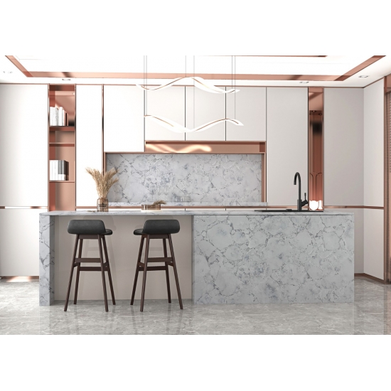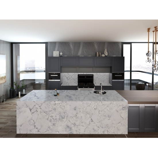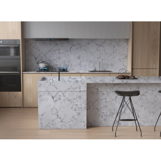 El cuarzo hormigón es un material de cuarzo artificial con un tratamiento especial. Similar a un acabado mate, el acabado de hormigón altera ligeramente el color del cuarzo en comparación con el clásico acabado pulido. Este acabado también se conoce como "cepillado" en el caso del granito.