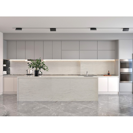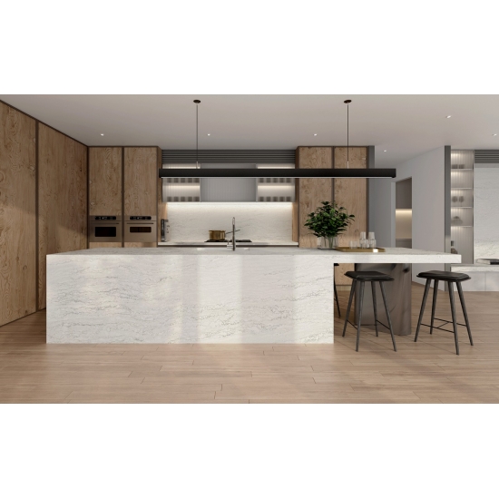 El cuarzo blanco cemento con textura de copo de nieve es una piedra artificial con un tratamiento especial. Similar a un acabado mate, el acabado de hormigón altera ligeramente el color del cuarzo en comparación con el clásico acabado pulido. Este acabado también se conoce como "cepillado" en el caso del granito.