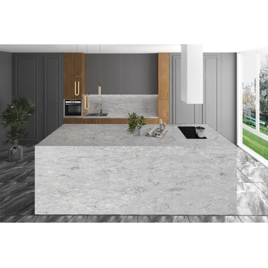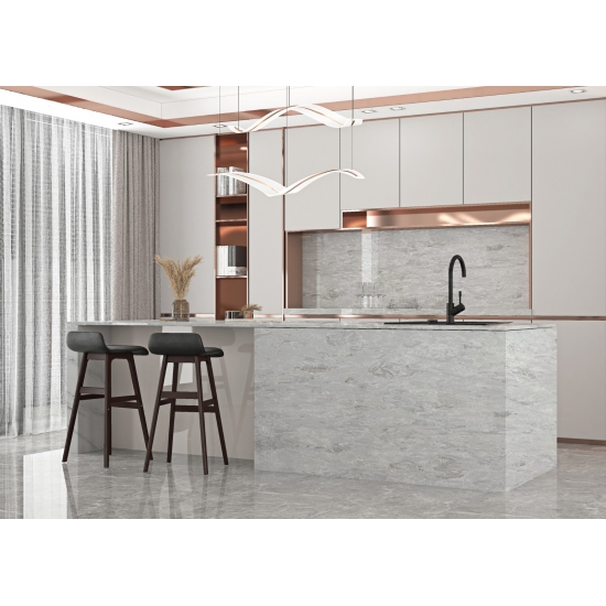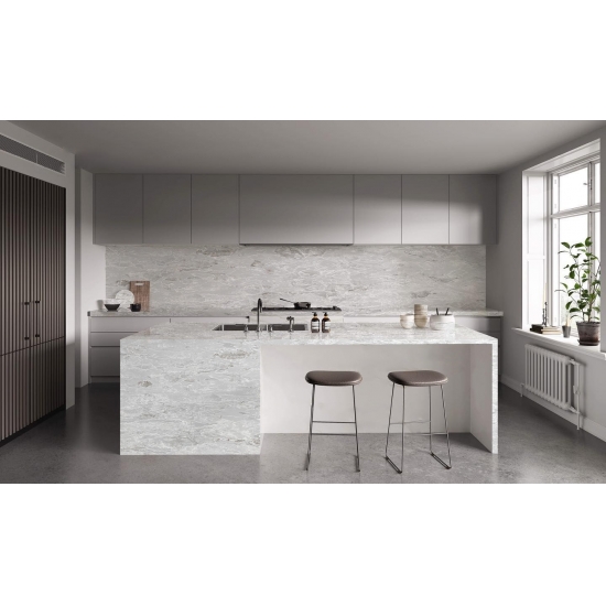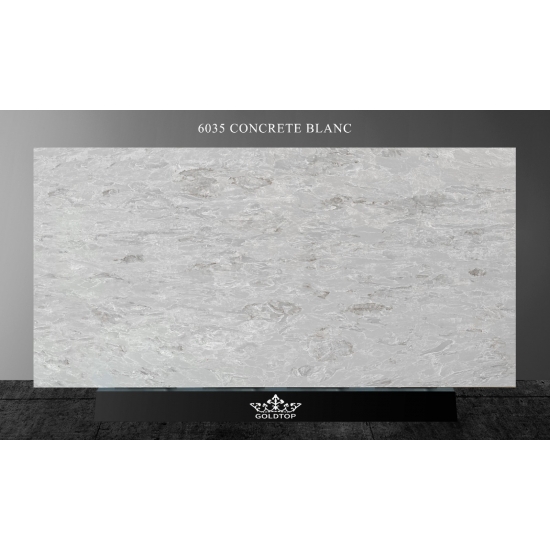 6035 Concrete Blanc es una piedra de atractivo moderno, con una textura similar al hormigón, pero con una superficie más refinada y lisa. Su color blanco brillante con sutiles matices grises le confiere un aspecto limpio y sofisticado. Esta piedra es ideal para la decoración contemporánea, especialmente en cocinas y baños, aportando un toque elegante y sofisticado a cualquier espacio.