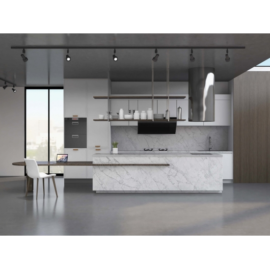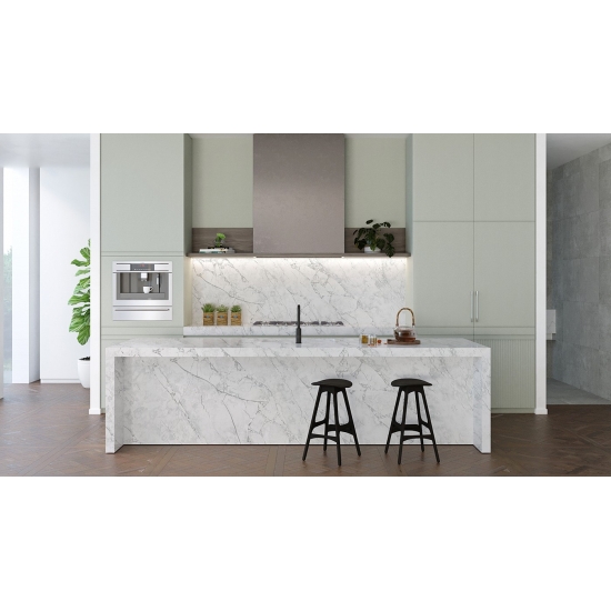 El cuarzo de la serie Calacatta es actualmente el producto de piedra de cuarzo más popular. Exquisito y único, el cuarzo Calacatta deslumbra con sus blancos limpios y su impactante veteado de aspecto mármol. Con su hermoso y llamativo patrón de vetas anchas y su tacto lujoso, este cuarzo ofrece el aspecto natural del mármol Calacatta, pero sin las desventajas de las encimeras de mármol. El cuarzo Calacatta es una encimera muy duradera, resistente a las manchas y a los arañazos, lo que lo convierte en una opción muy práctica para encimeras de cocina y baño, escaleras, alféizares, muebles a medida, aplicaciones en paredes y suelos interiores y exteriores, diseños con chorro de agua y otros proyectos de diseño.