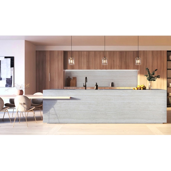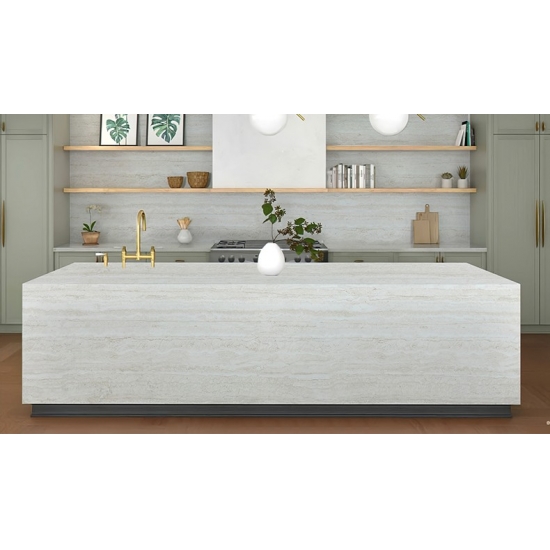 El cuarzo impreso en travertino romano PD revela un mundo sereno de elegancia atemporal. Bañado en un suave y cálido tono beige que evoca la seda bañada por el sol, su superficie irradia pureza y tranquilidad, creando una base visualmente relajante y restauradora. Sus delicadas vetas se entrelazan como huellas naturales del tiempo, añadiendo un toque artístico a su sobrio lujo. Cada centímetro fluye con una opulencia serena, infundiendo a cualquier espacio la serena quietud de la profundidad histórica.
