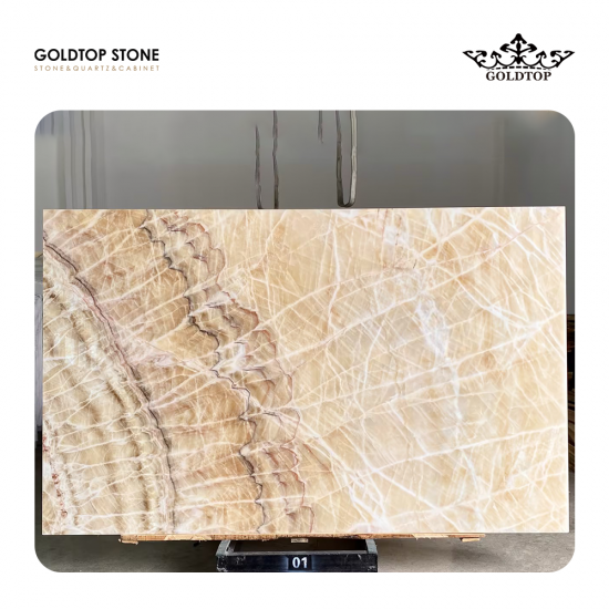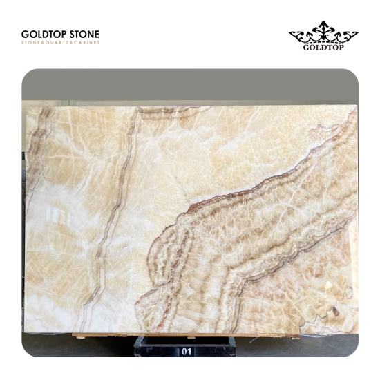 Ónix del Dragón Rojo El color principal es el amarillo, pero presenta un patrón que crea vetas de diferentes colores. Cada bloque de piedra tiene su propio patrón y carácter, lo que le permite tener una apariencia completamente distinta. Se utiliza para: suelos, paneles de pared, encimeras, encimeras de tocador, interiores, tableros de mesa, monumentos, mosaicos, fuentes, piscinas, alféizares y escaleras.