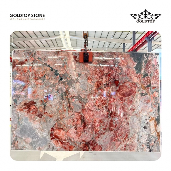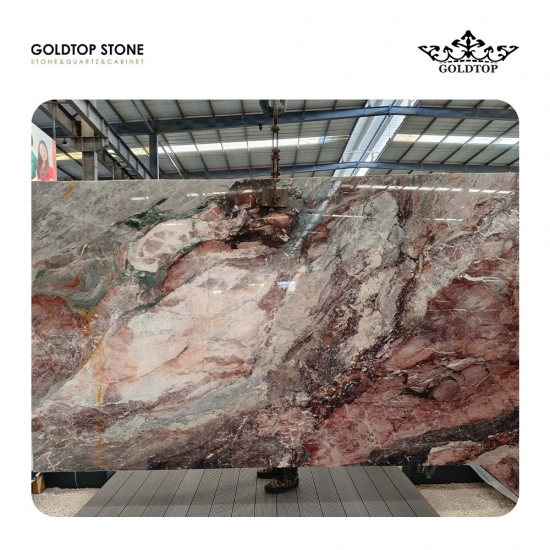 Mármol rosa flor de cerezo de Camboya Conocido por su excepcional composición de colores, Cherry Blossom combina rosas, rojos y azules en una expresión elegante y pictórica de arte natural. espesor: losa pulida de 3/4" (2 cm).